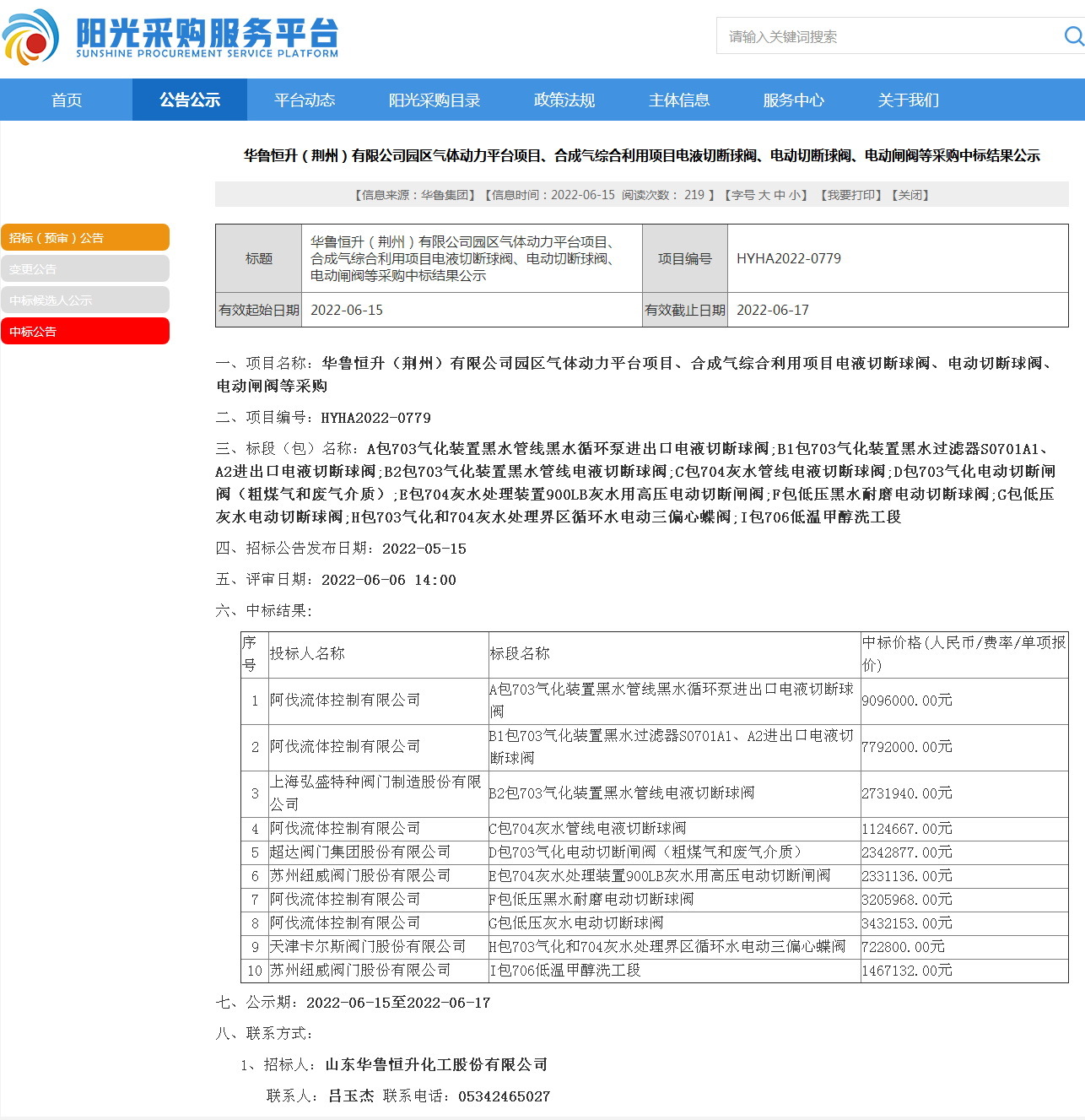 2022年6月份,阿伐流体控制有限公司(以下简称AFA公司)在华鲁恒升(荆州)有限公司园区气体动力平台、合成气综合利用项目耐磨球阀采购招标中再获大批订单。